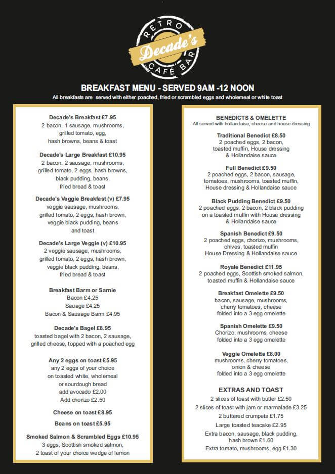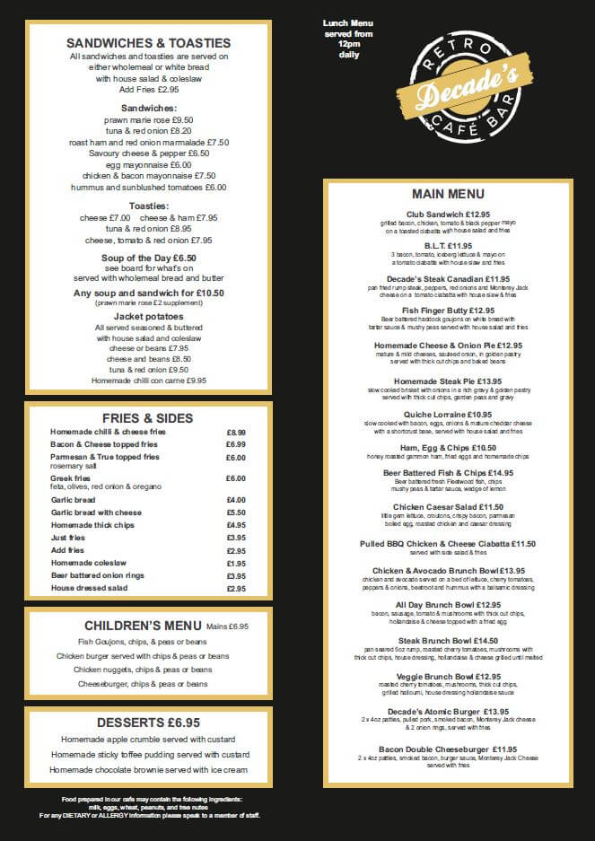 Explore our food and drink menus below. Everything is freshly prepared and served daily at Decades Retro Cafe Bar.